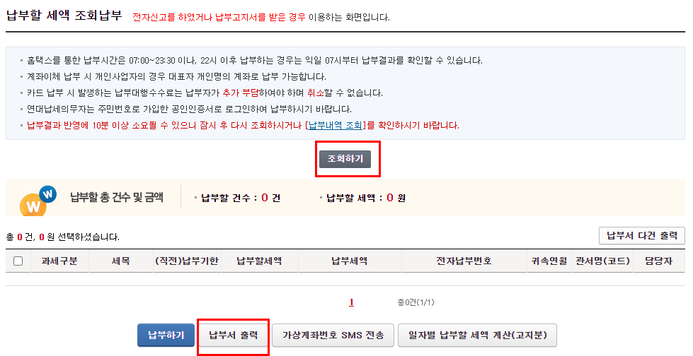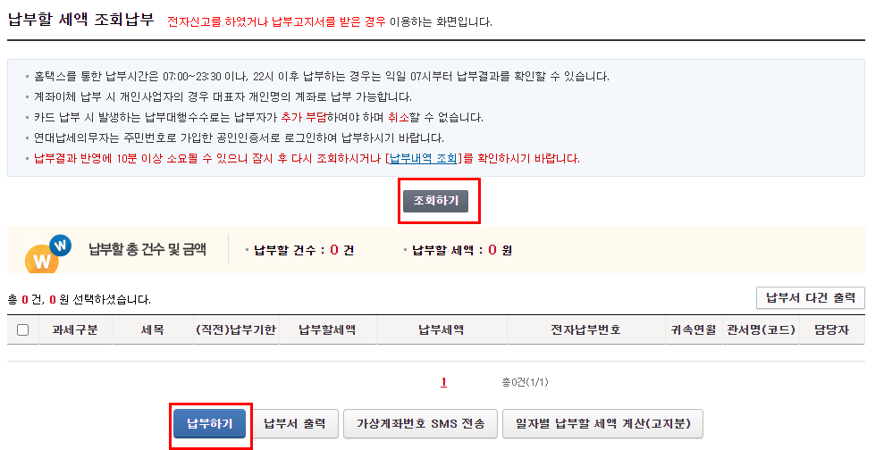 24-1. '조회하기' 눌러서 납부할세액 확인 후 납부하기를 눌러서 실시간계좌이체 또는 카드로 납부.