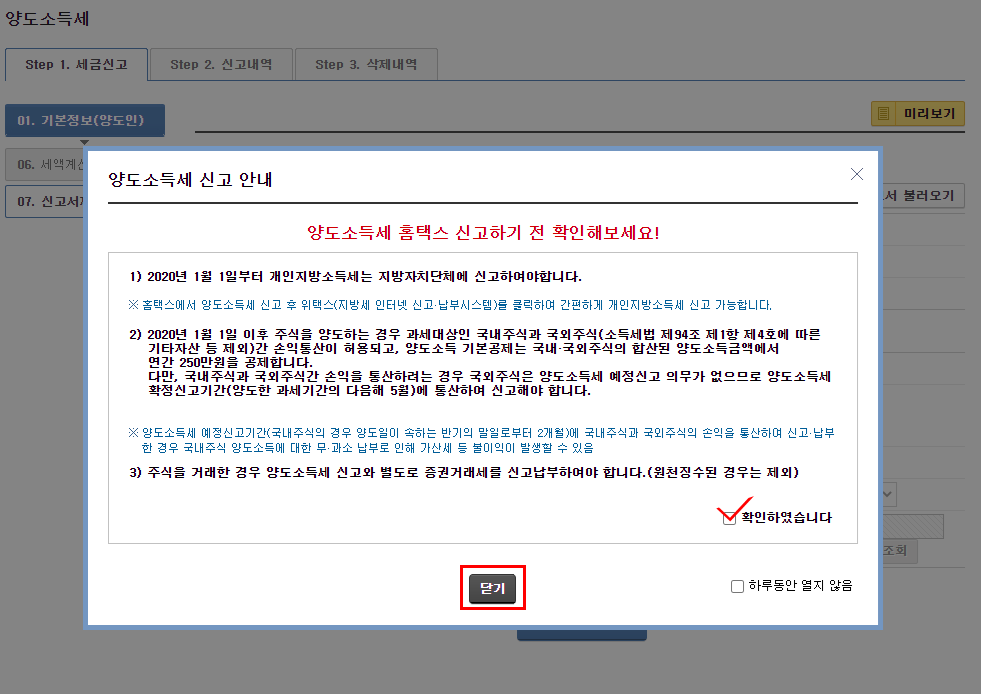 5. 양도소득세 신고 안내 읽어본 후 확인 체크하고 닫기 버튼 클릭