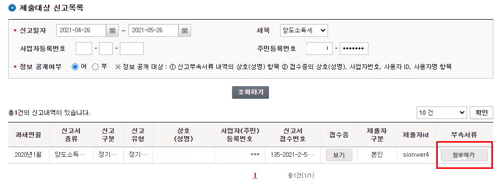 22. '첨부하기'가 '제출내역보기'로 바뀌어 있으면 신고 완료