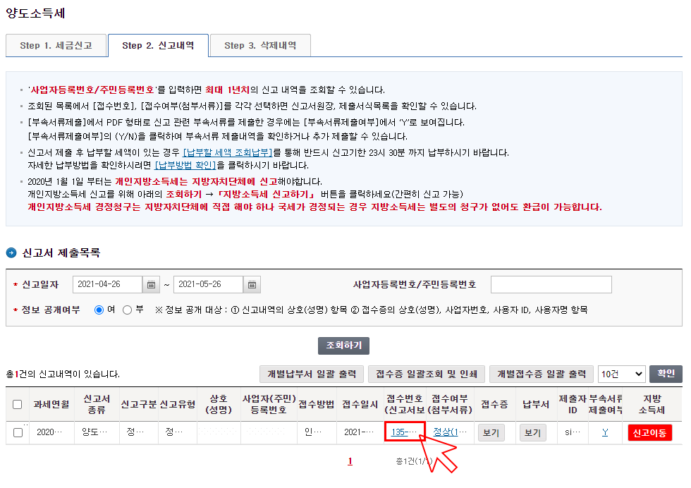 14. 양도소득세 신고화면에서 '신고내역' 탭 클릭