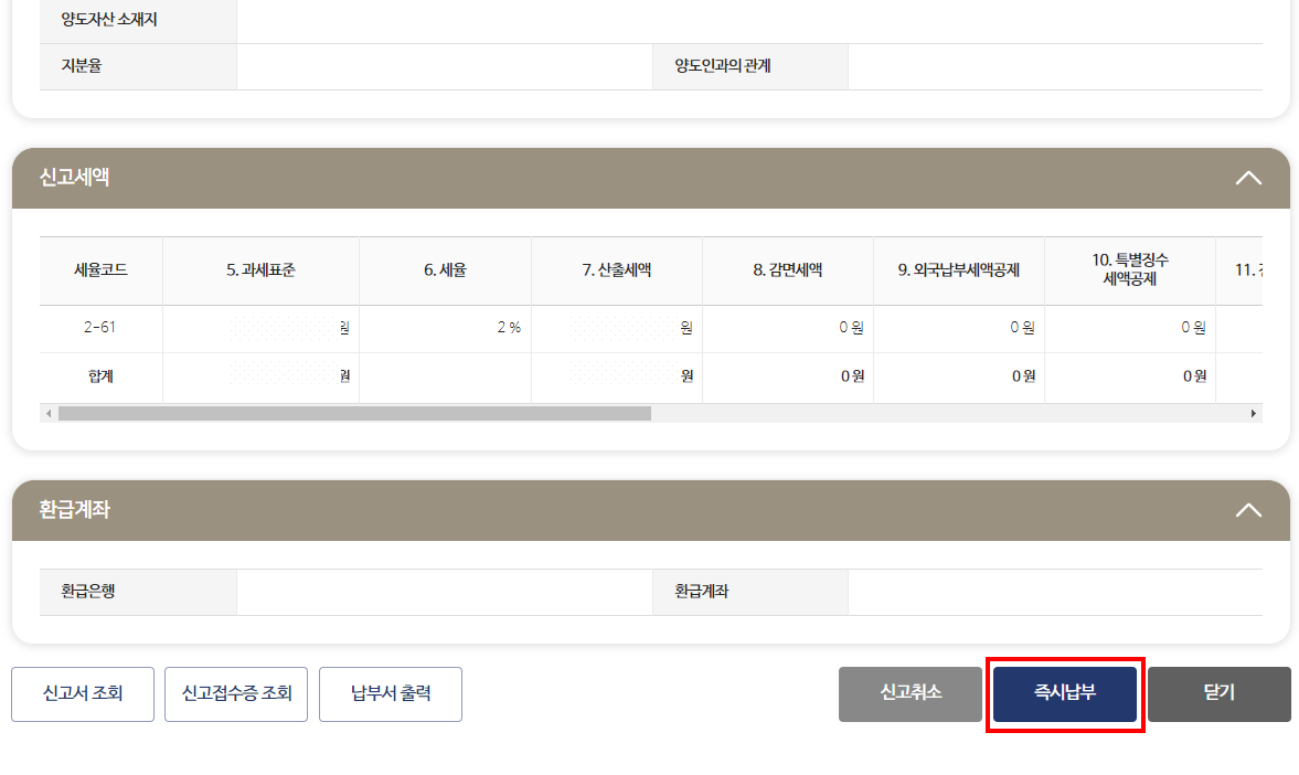 28. 산출세액 확인 후 즉시납부를 클릭하여 계좌이체 진행.
