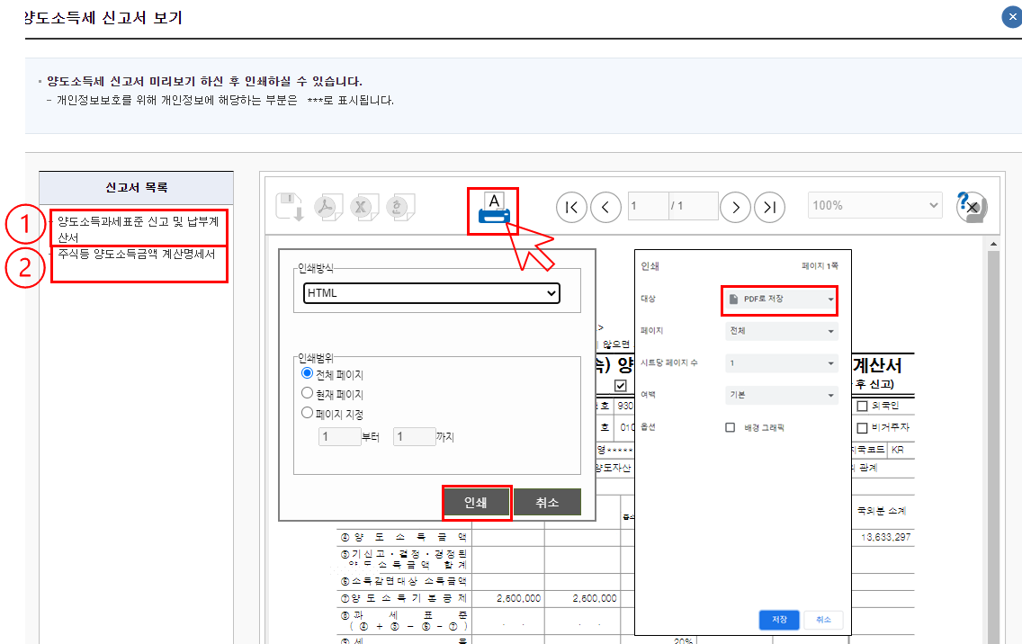 양도소득과세표준 신고 및 납부계산서 1부와 주식등 양도소득금액 계산명세서 1부를 각각 인쇄하여 PDF로 저장한다.