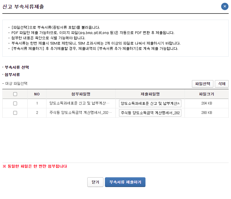 21. 파일 선택을 눌러 아까 PDF로 저장한 파일 2개를 첨부. '부속서류 제출하기' 클릭