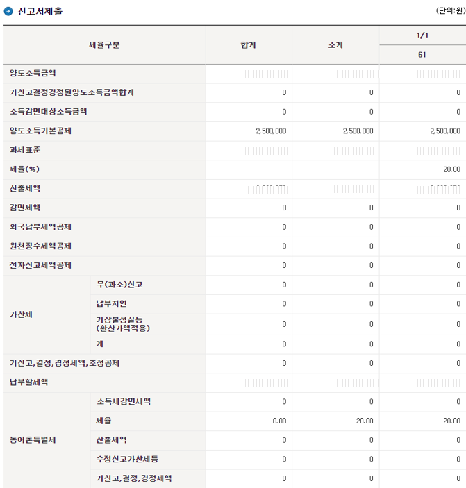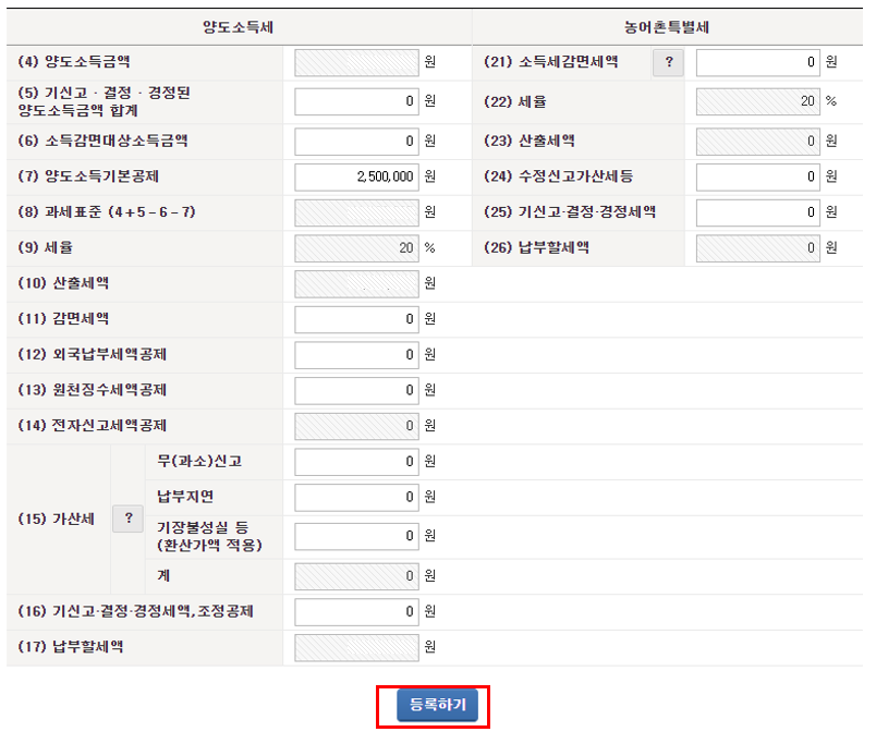 13. 양도소득기본공제에 250만 원 입력 후 '등록하기' 클릭