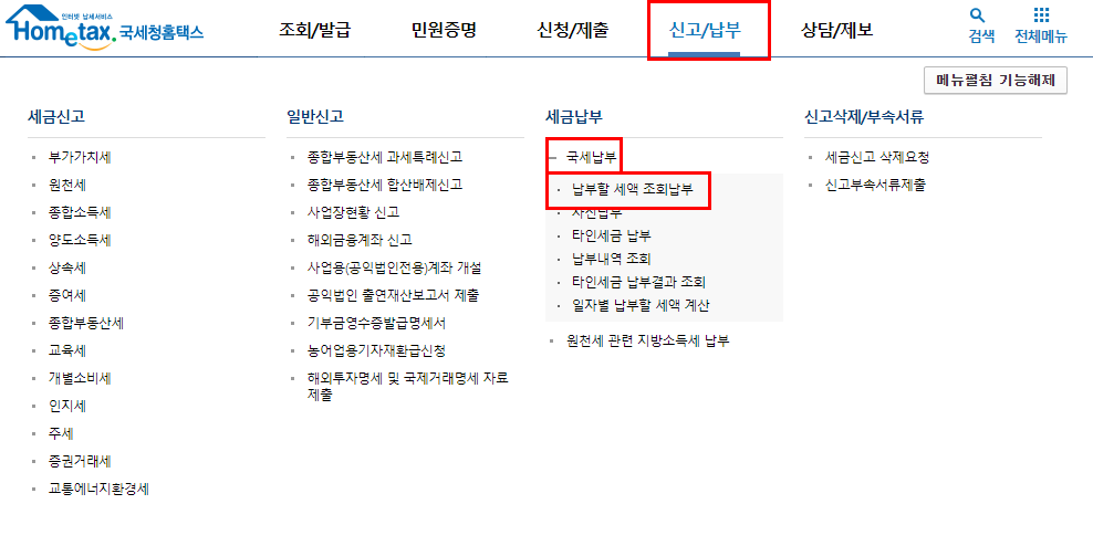 23. 국세청홈택스에서 '신고/납부 - 국세납부 - 납부할 세액 조회납부' 차례로 클릭.