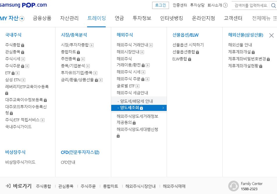 [삼성증권] 트레이딩 - 해외주식 -해외주식 세금안내 - 양도세조회