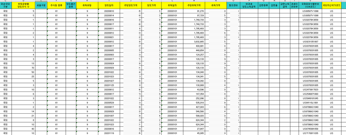 취득유형별 양도주식 수, 주식등 종류(해외주식은 '61'), 취득유형, 양도일자, 주당양도가액, 양도가액, 취득일자, 주당취득가액, 취득가액, 국외자산코드(미국은 'US')