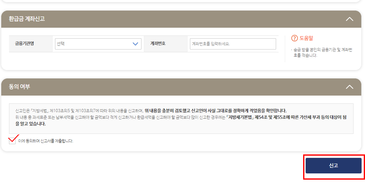 '신고이동'링크로 들어가면 신고자 인적사항과 소득정보, 신고세액은 자동으로 입력되어있다. 연락처를 입력하고 은행 선택, 계좌번호를 입력하고 동의 여부로 가서 체크 후 신고를 클릭한다.