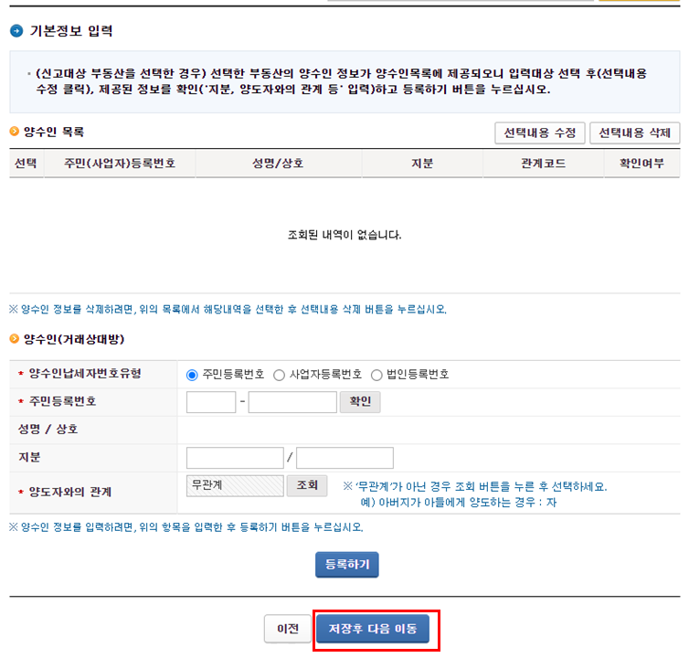 7. 양수인 정보 입력 내용 없음. 바로 '저장 후 다음 이동' 클릭