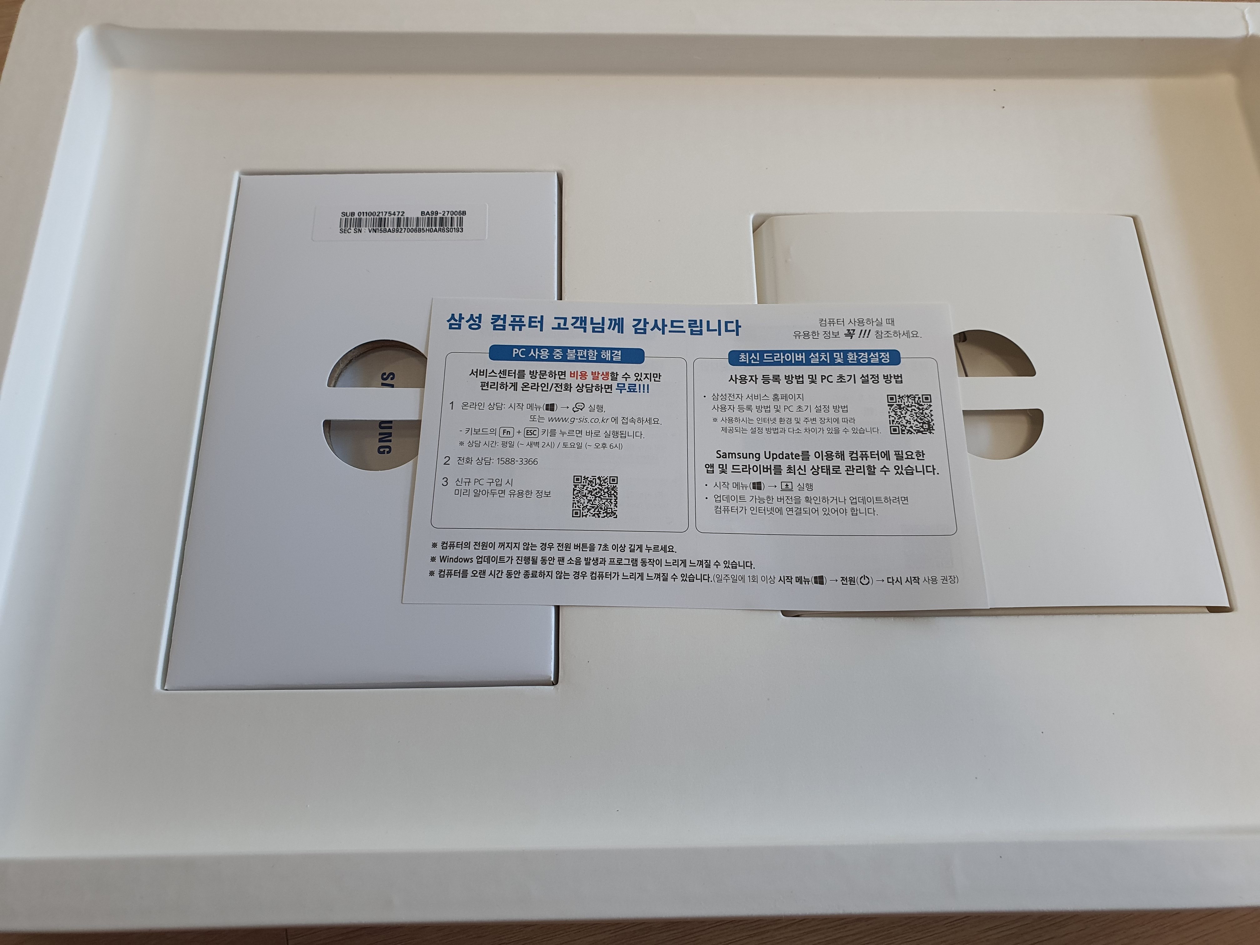 노트북 아래에는 부수품들이 들어있다. AS문의 방법이라던지, 갤럭시북 구매 고객 전용 SW(한글 등) 다운로드 안내에 대한 종이가 들어있다. 그리고 그 아래에는 노트북 전원 어댑터와 기본 제공 블루투스 마우스가 들어있다.