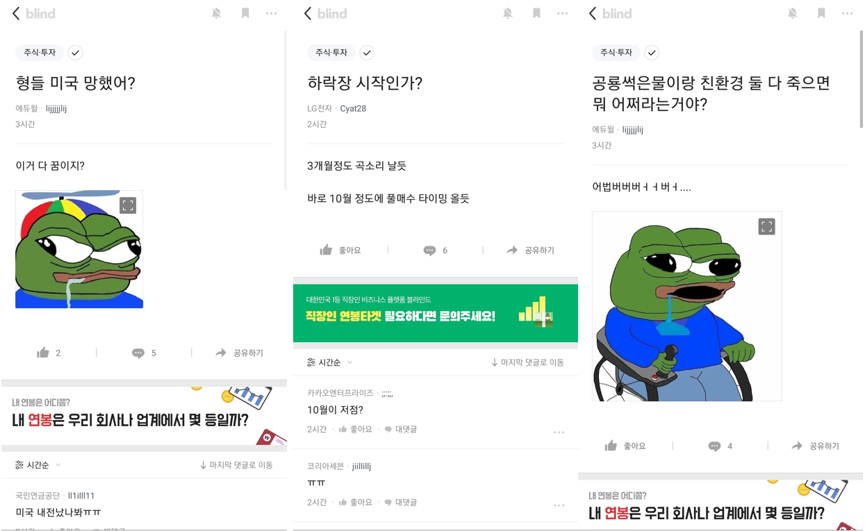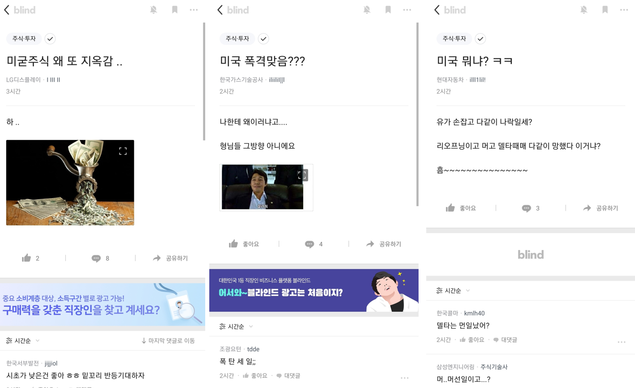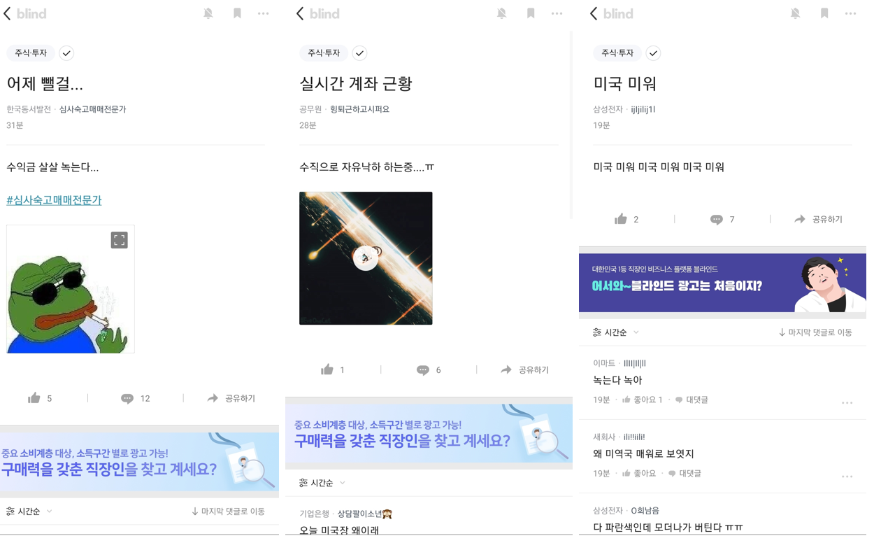 오늘처럼 시장 전체가 안 좋으면 커뮤니티는 다음과 같은 반응들이 채워진다.
