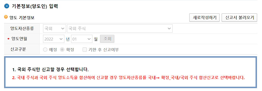 양도 기본 정보는 국외 - 국외 주식을 선택한다. 만일 해외주식 뿐만 아니라 국내 주식으로 양도소득세가 발생하신 분은 국내-국내 국외 주식 합산을 선택해야한다. 현재 글은 오로지 해외주식 양도소득세에 대해서만 다루므로 국외 및 국외주식을 선택하여 진행하도록 하겠다.