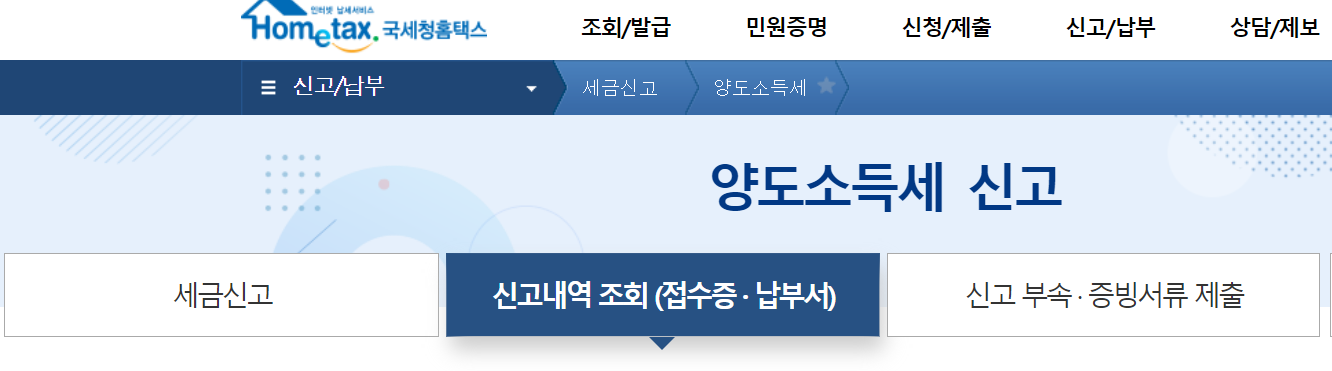 신고/납부 - 세금신고 - 양도소득세 - 신고내역 조회로 이동한다.