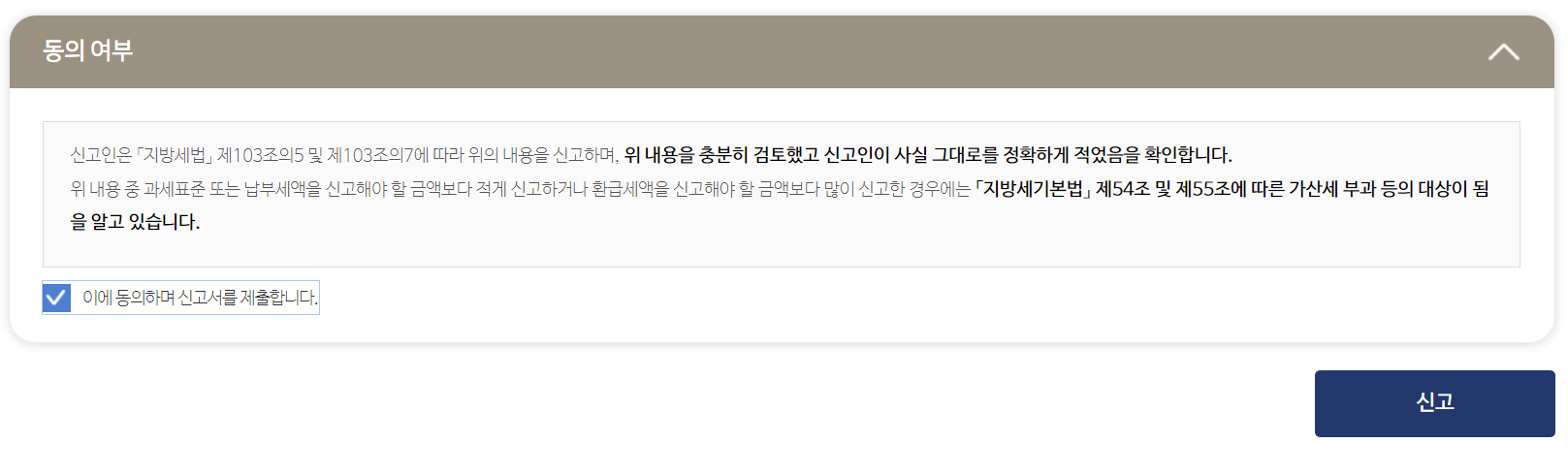 홈택스를 통하여 이와 같이 접근했다면 납부세액은 자동으로 모두 입력되어있을 것이다. 특별이 더 입력할 것은 없고, 본인의 연락처와 주소 정보가 잘 입력되어있는지만 확인한 후, 신고서 동의에 체크한 후 '신고' 버튼을 누르면 된다.