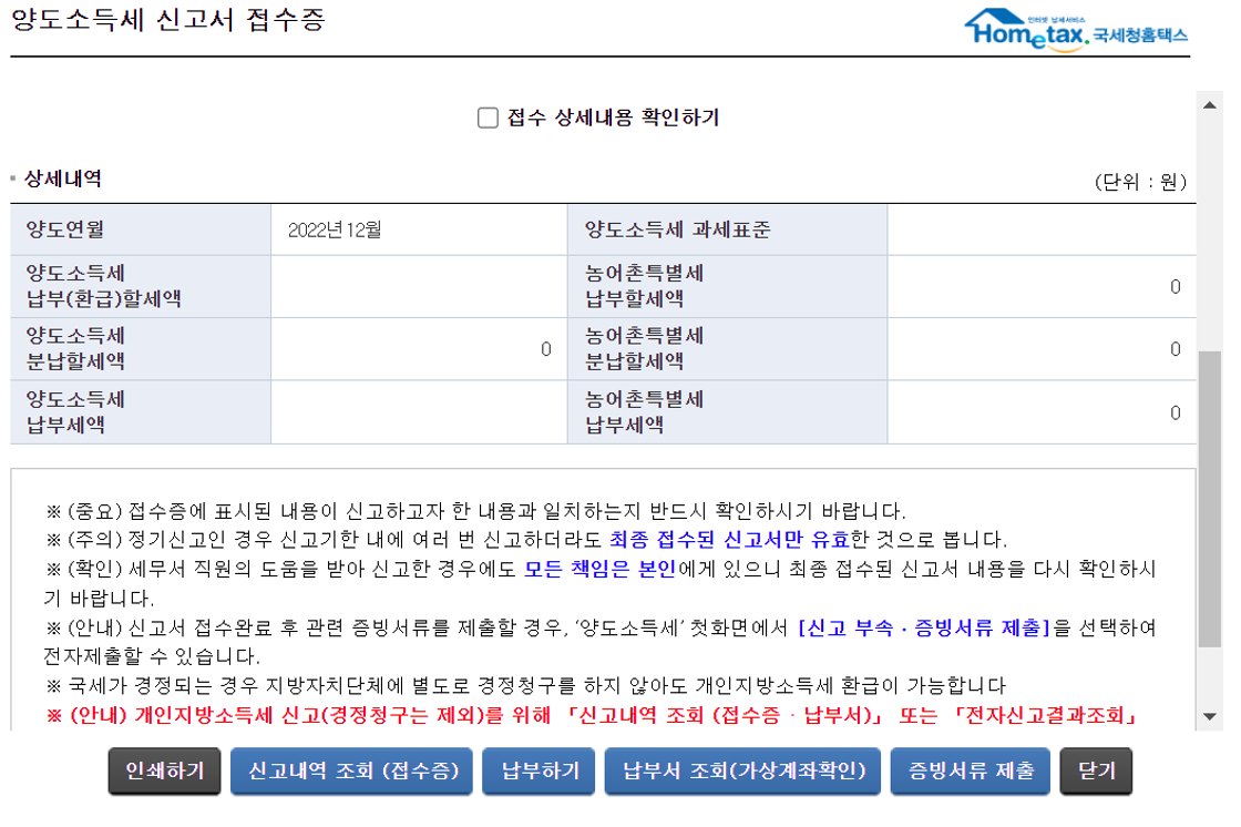 신고가 완료되면 위처럼 창이 뜬다. 만일의 사태를 대비하여 인쇄하기를 눌러 방금 생성한 신고서를 PDF 파일로 다운로드하여 보관하도록 하자.