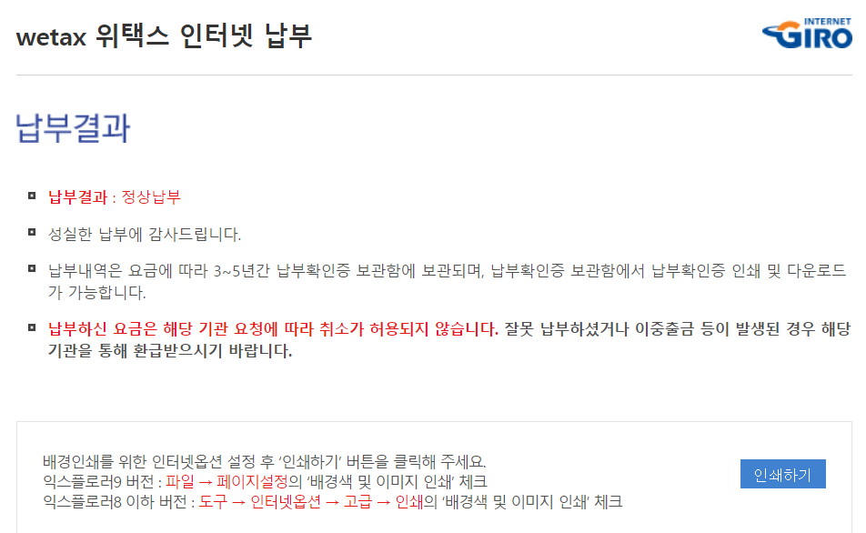 정상적으로 납부되면 위와 같은 화면이 뜬다.