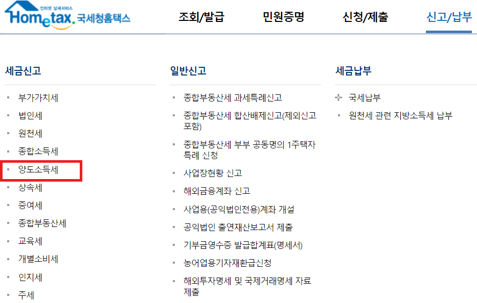 위쪽 탭에서 신고/납부로 들어가 양도소득세 메뉴를 클릭한다.