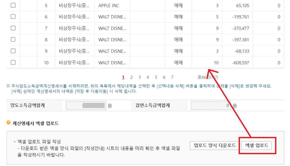 매도 기록에 대한 데이터가 자동반영되도록 홈택스가 정해준 엑셀 양식을 따라야 한다. 업로드 양식 다운로드를 클릭하여 엑셀 양식을 다운받자.
