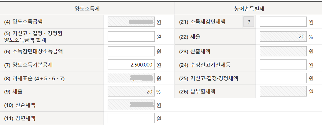 양도소득기본공제 250만원은 직접 입력해야 적용된다.