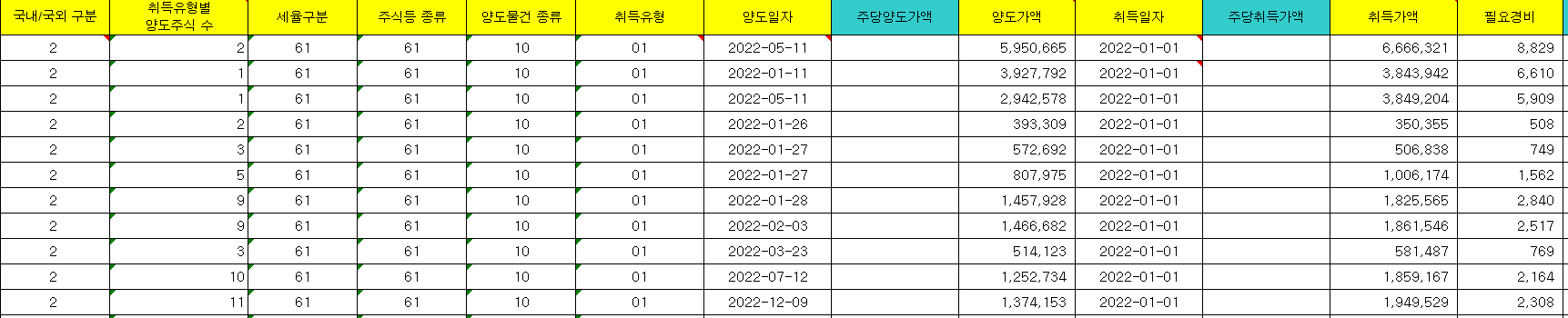 주식 종목명, 국내/국외 구분, 취득유형별 양도주식 수, 세율구분, 주식등 종류, 양도물건 종류, 취득유형, 양도일자, 양도가액, 취득일자, 취득가액, 필요경비, 국제증권식별번호(ISIN), 국외자산국가코드