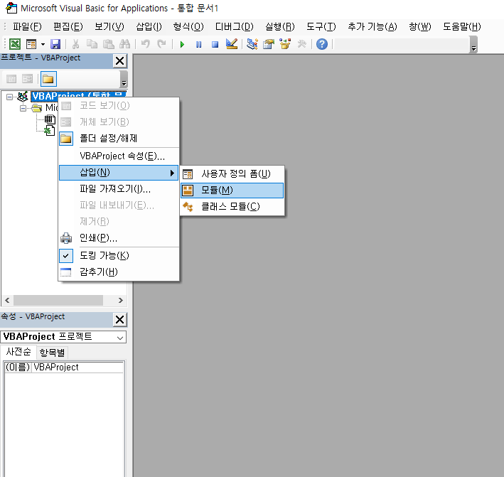 2. VBAProject에 마우스 오른쪽 버튼 누르고 새 모듈을 생성한다.