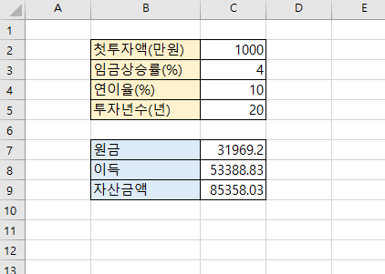투자액, 임금상승률, 연 수익률, 투자기간을 차례로 입력해보자.
