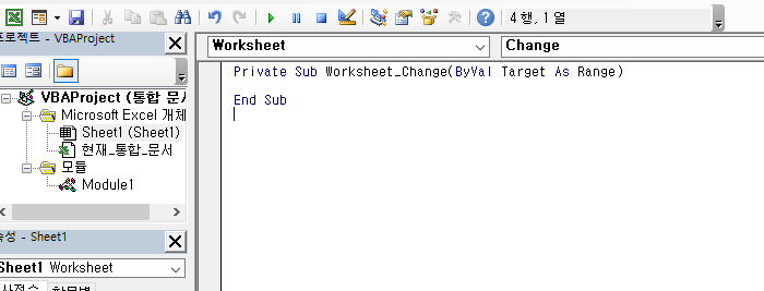 다행히 VBA에는 Worksheet 자체 프로시저가 존재해서 Excel에서 특정 셀 값이 변경될 때 동작하는 매크로를 설정할 수 있다.