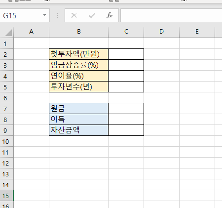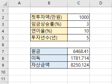 ① 첫 투자금액, 임금상승률, 연 수익률, 투자 기간을 각각 입력한다.